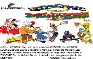 With a new breath of fresh air, Mr. Guillaume decided he would need a home and the proper mascot(s) for his constant art production. "One afternoon in 2001 I was watching Superman 2 on a local cable channel. The main protagonist was named General ZOD and I thought, that is a HARDCORE name! Then it came to me, because of thinking of the word ,HARDCORE. Took out the word hard and replaced it with ZOD, ZODCORE. I made it my email, thought it sounded cool". On November 10, 2009, Mr. Guillaume bought the name ZODCORE through the Florida Department of State Division of Corporations and never looked back. With ZODCORE being a full fledged corporation, it needed a mascot. Instead, it got seven mascots who love to skate board, known today as Kongcrete Monkeys Mr. Guillaume's third comic strip. The comic strip would later help give ZODCORE a main purpose. Which is to create good entertainment through comic strips and board graphics for extreme sports.